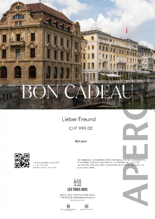 Faites plaisir avec un bon cadeau et offrez nos prestations hôtelières variées, y compris nos restaurants Cheval Blanc by Peter Knogl, Brasserie Les Trois Rois, Banks Basel, Seijaku, ainsi que le Bar Les Trois Rois et le salon à cigares « The Council ».